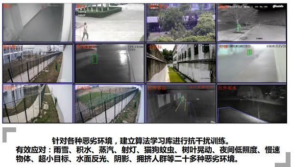 趨視科技針對各種惡劣環(huán)境,建立算法學(xué)習(xí)庫進行抗干擾訓(xùn)練,能有效滿足雨雪、積水、蒸汽、射燈、貓狗蚊蟲、樹葉晃動、夜間低照度、慢速物體、超小目標、水面反光、陰影、擁擠人群等二十多種惡劣環(huán)境的應(yīng)用需求。